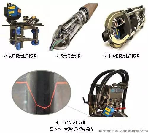 新型的不銹鋼管道焊接系統(tǒng)集成了激光視覺焊接和檢測(cè)技術(shù)。該系統(tǒng)主要包括以下組件:坡口加工站應(yīng)用的坡口視覺檢測(cè)設(shè)備(見圖2-25a),合金鋼管焊接時(shí)背部用來控制和監(jiān)視清理艙室參數(shù)的視覺清渣設(shè)備(見圖2-25b),焊接工作站應(yīng)用的根焊道視覺檢測(cè)設(shè)備(見圖2-25c),以及具有自適應(yīng)焊接控制技術(shù)的視覺外焊機(jī)(見圖2-25d)。四種組件均采用激光視覺技術(shù)同時(shí)工作,從而將管道自動(dòng)焊接工藝的質(zhì)量和速度提高到前所未有的水平。