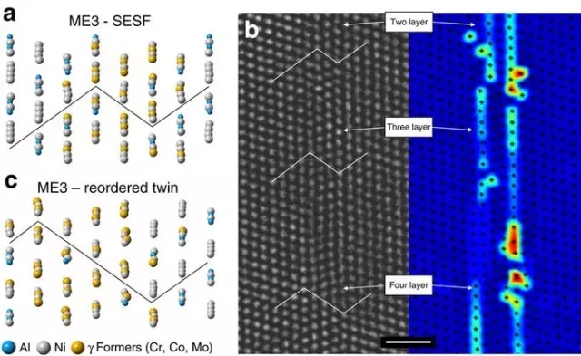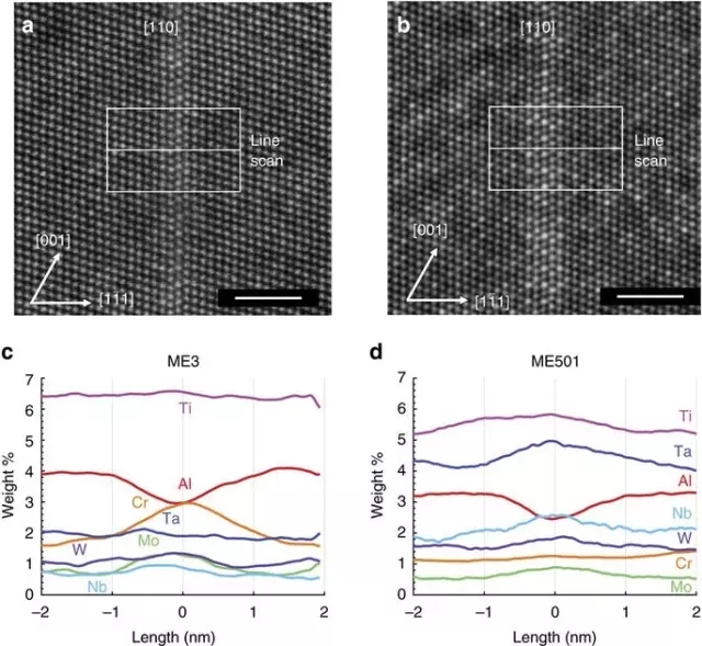圖2:在ME3和ME501中沿層錯偏析。在[110]晶帶軸上獲得的HAADF-STEM圖像揭示(a)沿ME3中的超晶格外部堆垛層錯的偏析和(b)沿ME501中的超晶格外部堆垛層錯的η相的偏析和“網(wǎng)格狀”順序。集成的EDX線掃描顯示分別沿著(c)ME3和(d)ME501的超晶格外部堆垛層錯的元素偏析,如(a,b)中所示。未給出在這兩種情況下Co的富集和沿著層錯的Ni含量的耗損,標尺為2nm。