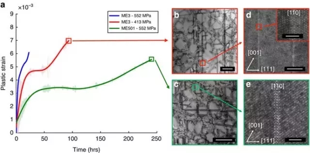 圖1:壓縮蠕變數(shù)據(jù)和變形機制。(a)分別為ME3和ME501在760℃和552MPa(分別為藍色和綠色)和ME3在414MPa(紅色)下的[001]壓縮蠕變曲線,以實現(xiàn)可比的應(yīng)變速率(5×10-9 s-1)。[001]晶帶軸BF-STEM圖像揭示了在后[001]蠕變(b) ME3和(c)ME501晶體中的孤立的超晶格外部堆垛層錯和納米孿晶。HAADF-STEM圖像顯示(d)ME3中的納米孿晶和(e)ME501中的超晶格外部堆垛層錯。(d)圖顯示了更高放大倍率的ME3中的孿晶界面。 b,c,標為500nm。d,標尺為5nm(插圖,2nm)。 e,標尺為2 nm。