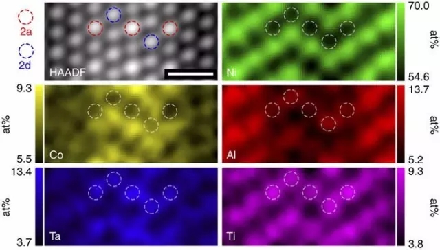 圖3:在ME501合金中跨越超晶格外部堆垛層錯高分辨率元素分布圖。在γ'相中的兩層堆垛層錯處形成的η相的原子尺度的量子化原子分辨率EDX元素分布圖。左上圖是層錯內(nèi)顯示特征排序強度的層錯HAADF-STEM圖像; Ni亞晶格(綠色); 偏析到Ni位點的Co(黃色);偏析到Wyckoff 2a位點的Ta(藍色);Al和Ti(分別是紅色和洋紅色),偏析到Wyckoff 2d位點。所有元素值均為原子百分含量。標尺為0.5nm。