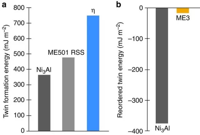 圖5:超晶格外部堆垛層錯和納米孿晶動力學DFT計算。(a)在實驗中觀察到,通過在具有隨機固溶體的Ni3Al中,ME501中的重新排序之前沿著超晶格外部堆垛層錯剪切的孿晶形成的能量消耗,即沒有偏析(RSS),并且ME501,其中η沿著層錯形核,的。注意沿著具有η相的超晶格外部堆垛層錯形成孿晶的能量消耗較大。(b)孿晶生成后由于重排序產(chǎn)生的能量差異。 ME3較小的差異表明,替代Ni和Al的γ相形成元素(Co,Cr和Mo)的偏析已經(jīng)去除了層錯附近的沉淀物中的最鄰近的違規(guī),使得ME3的孿生更容易。