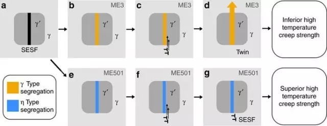 圖6:ME501中的相變強化。(a)在γ'相沉淀物中孤立的SESF的示意圖。(b)γ形成元素(Co,Cr和Mo)沿ME3中的SESF偏析。(c)在ME3中的SESF附近的γ-γ'界面處,兩個以上的位錯發(fā)生相互作用。(d)兩個更多的肖克利不全位錯沿著SESF剪切,形成能夠剪切γ和γ'沉淀物的四層孿晶 (e)在ME501中沿著SESF偏析的η相形成元素(Co,Ta,Ti和Nb)。 (f)在ME501中的SESF附近的γ-γ'界面處,兩個以上的位錯發(fā)生相互作用。(g)圖5中,位錯在ME501中不能形成孿晶。