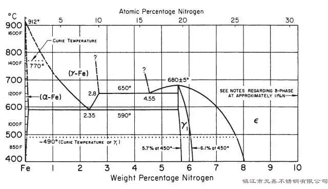 氮化是一種將新生氮擴(kuò)散到鋼和鑄鐵表面的鐵素體熱化學(xué)方法。這種擴(kuò)散過程主要依賴于氮在鐵中的溶解度,如鐵-氮平衡圖所示(圖1)。
