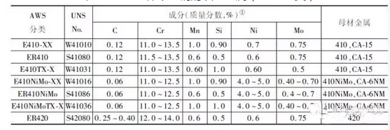 表2用于馬氏體不銹鋼的填充金屬(AWS分類)