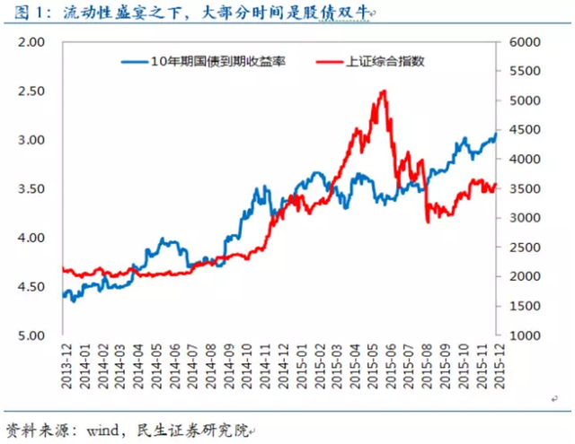 在這種流動性驅(qū)動的邏輯下,大部分時候沒有所謂的股債輪動,而只有股債聯(lián)動。當流動性趨于寬松時,本身具有流動性溢價的股債市場呈現(xiàn)雙牛(比如從2014年初開始有序打破剛性兌付到現(xiàn)在,流動性總體上越來越寬松,股債都漲了很多);當流動性趨于緊張時,會出現(xiàn)股債雙熊(比如6月股災(zāi)前后股債表現(xiàn)都不好)。只不過一般以機構(gòu)投資者為主的債市反應(yīng)要領(lǐng)先于以散戶為主的股市,比如6月股災(zāi)之前債市已經(jīng)先跌了一波。