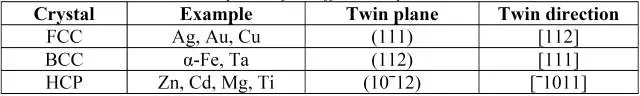 當(dāng)然,孿生和滑移可能按順序發(fā)生或甚至在某些情況下同時發(fā)生。表2給出了一些金屬的孿生系。