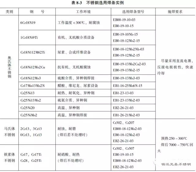 1) 必須根據(jù)母材的成分、產(chǎn)品使用要求正確地選擇焊條。表8-3列出了幾種國產(chǎn)焊條型號及其特點,以供參考。由于不銹鋼金屬系列很多,每一牌號焊條都有其最適用的工作條件,選擇時要適當(dāng)。奧氏體鋼焊條,按藥皮類型來說,常用的有低氫鈉型和鈦鈣兩類。鈦鈣型焊條如EB0-19-10-03、EB0-18-120Mo2-03等,電弧穿透淺,適于薄板平焊位置焊接。若用直流焊接電源時,也可進行全位置和中板的焊接,但要求技術(shù)熟練。低氫鈉型焊條如EB0-19-10Nb-15、EB1-23-13-15等適于全位置和中厚板的焊接,不易產(chǎn)生夾渣、未焊透等缺陷。從抗裂角度考慮,傾向于采用低氫鈉型焊條,但焊縫成形不如鈦鈣型,因而對耐蝕性也有些不利。(http://www.290n.cn)