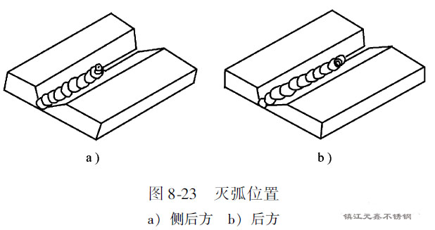 4)焊接電纜卡頭在工件上要卡緊,以免發(fā)生打弧現(xiàn)象,燒傷表面。引弧可以采用劃擦法,但最好采用碰擊法,并且都應(yīng)在坡口內(nèi)進行。嚴(yán)禁在鋼板上隨便引弧,以免電弧擦傷處腐蝕性能的降低。更換焊條或者焊接中斷后繼續(xù)焊接時,重新引弧的位置應(yīng)在離末尾焊點10mm的焊道上,然后以普通焊速將電弧移到末尾焊點上,進行接頭的焊接。滅弧時,一般應(yīng)把電弧移到熔池的后方或側(cè)后方,然后熄滅。這樣可以使收弧點逐漸縮小,并且落在焊道上,如圖8-23所示。其優(yōu)點是收尾熔池飽滿,不易產(chǎn)生裂紋。