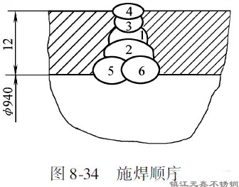 筒體成形后裝配定位焊,每隔200~250mm定位焊25mm,定位焊縫高度為4~5mm。施焊順序如圖8-34所示。先在筒內(nèi)焊接第1~2道,這兩道焊縫的起焊和終止端應(yīng)相反。然后在筒外清理焊根,再焊第3~4道。同樣注意各道之間的起焊與終止方向要相反。這樣焊波錯開以免產(chǎn)生夾渣。焊條不作橫向擺動,對準(zhǔn)中心線焊接。清理焊根時在筒外用碳弧氣刨進行,碳棒直徑為8mm,電流為250~300A,碳棒與焊縫夾角45°,刨槽深4mm,將第一層焊道根部可能有缺陷的金屬全部刨除,刨后清除熔渣。當(dāng)?shù)谌、四層焊道焊完之后,最后在筒?nèi)焊接與腐蝕介質(zhì)相接觸的第五、六層焊道。