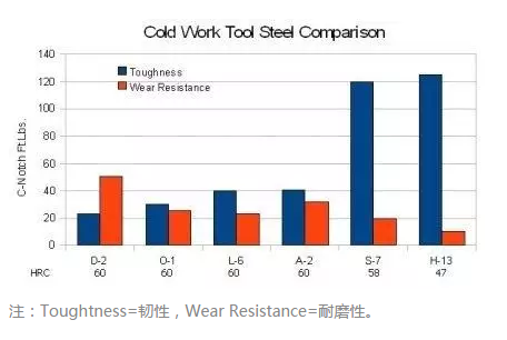 從硬度、耐磨及韌性三個(gè)指標(biāo)(見(jiàn)下圖)來(lái)看,S7的性能介于A2和H13之間,可彌補(bǔ)此二者之不足。