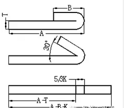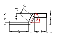 Z折3 (斜邊段差): 1. 當H¢2T時 j當θ≦70°時,按Z折1(直邊段差)的方式計算, (此時L=0.2). k當θ>70°時完全按Z折1(直邊段差)的方式計算 2. 當H/2T時, 按兩段折彎展開(R=0 θ≠90°).  |