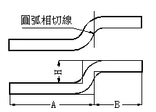 1. H≦2T 段差過渡處為非直線段為兩圓弧相切展開時,則取兩圓弧相切點處作垂線,以保證固定邊尺寸偏移以一個料厚處理,然后按Z折1(直邊段差)方式展開 2. H>2T,請示后再行處理  |