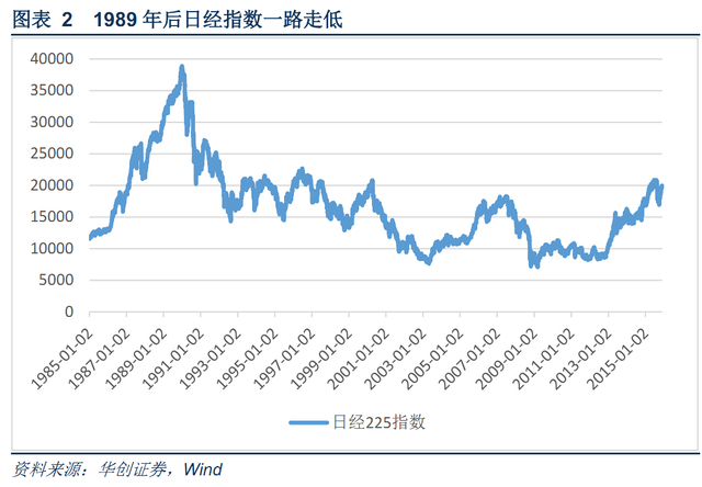 泡沫經(jīng)濟(jì)崩潰以后,最直接的影響就是資產(chǎn)價格的嚴(yán)重縮水。泡沫經(jīng)濟(jì)崩潰后,日本的土地資產(chǎn)和股票資產(chǎn)約縮水1300萬億日元。從股票價格變化來看,1989年12月,東京證券交易所的日經(jīng)225指數(shù)曾高達(dá)38915.87 點(diǎn),股票的總市值高達(dá)630 萬億日元,大約相當(dāng)于當(dāng)年日本名義GNP總額的1.6倍。1990年泡沫破滅后,日經(jīng)指數(shù)迅速跌破2萬點(diǎn)大關(guān),跌幅幾乎達(dá)到50%,短短一年的時間里東京股票市場的總市值蒸發(fā)了270萬億日元。