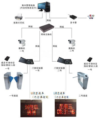 主要由計(jì)算機(jī)/打印機(jī)、智能讀卡器、智能控制器、攝像機(jī)、視頻服務(wù)器、智能閘機(jī)、智能卡及管理軟件等組成。采用TCP/IP網(wǎng)絡(luò)結(jié)構(gòu)通訊,通訊距離可無(wú)限擴(kuò)展,單臺(tái)計(jì)算機(jī)可接任意數(shù)量智能閘機(jī)。智能閘機(jī),既可聯(lián)網(wǎng)運(yùn)行,又可脫機(jī)運(yùn)行。系統(tǒng)組成圖如下: